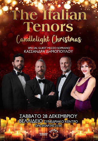 Πιστοί στο Χριστουγεννιάτικο rendez-vous τους με το κοινό της Θεσσαλονίκης, οι αγαπημένοι του ελληνικού κοινού "The Italian Tenors", έρχονται το Σάββατο 28 Δεκεμβρίου στο Συνεδριακό Κέντρο Ιωάννης Βελλίδης για μία και μοναδική εμφάνιση Υπό το Φως των Κεριών με την παράσταση «Candlelight Christmas», δίνοντας μια ρομαντική μουσική πινελιά, στο εορταστικό πνεύμα των Χριστουγέννων και της Πρωτοχρονιάς, της πιο ωραίας εποχής του χρόνου. Μαζί τους, μία εκλεκτή καλεσμένη, η γνωστή μεσόφωνος, Κασσάνδρα Δημοπούλου.
